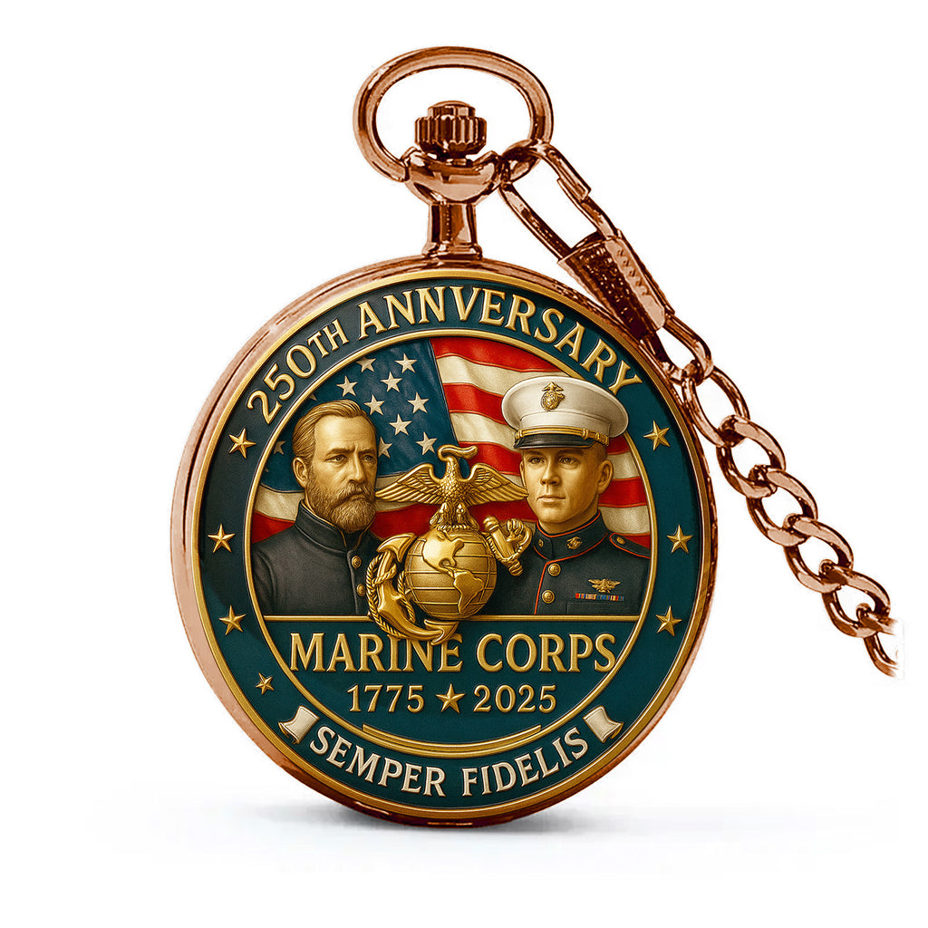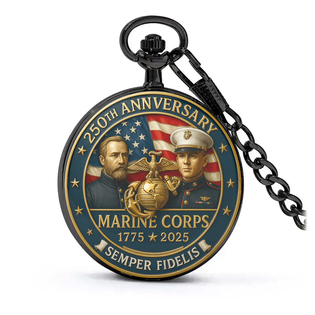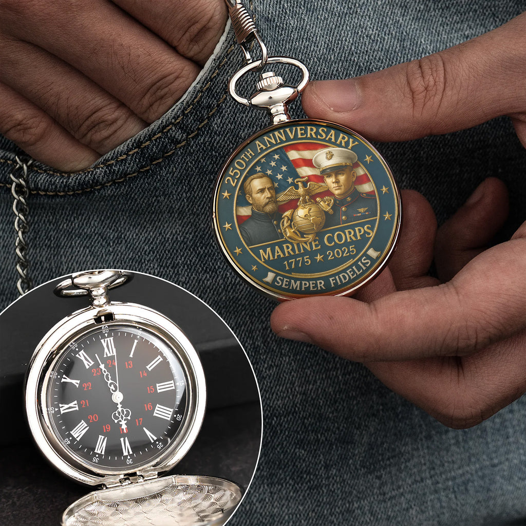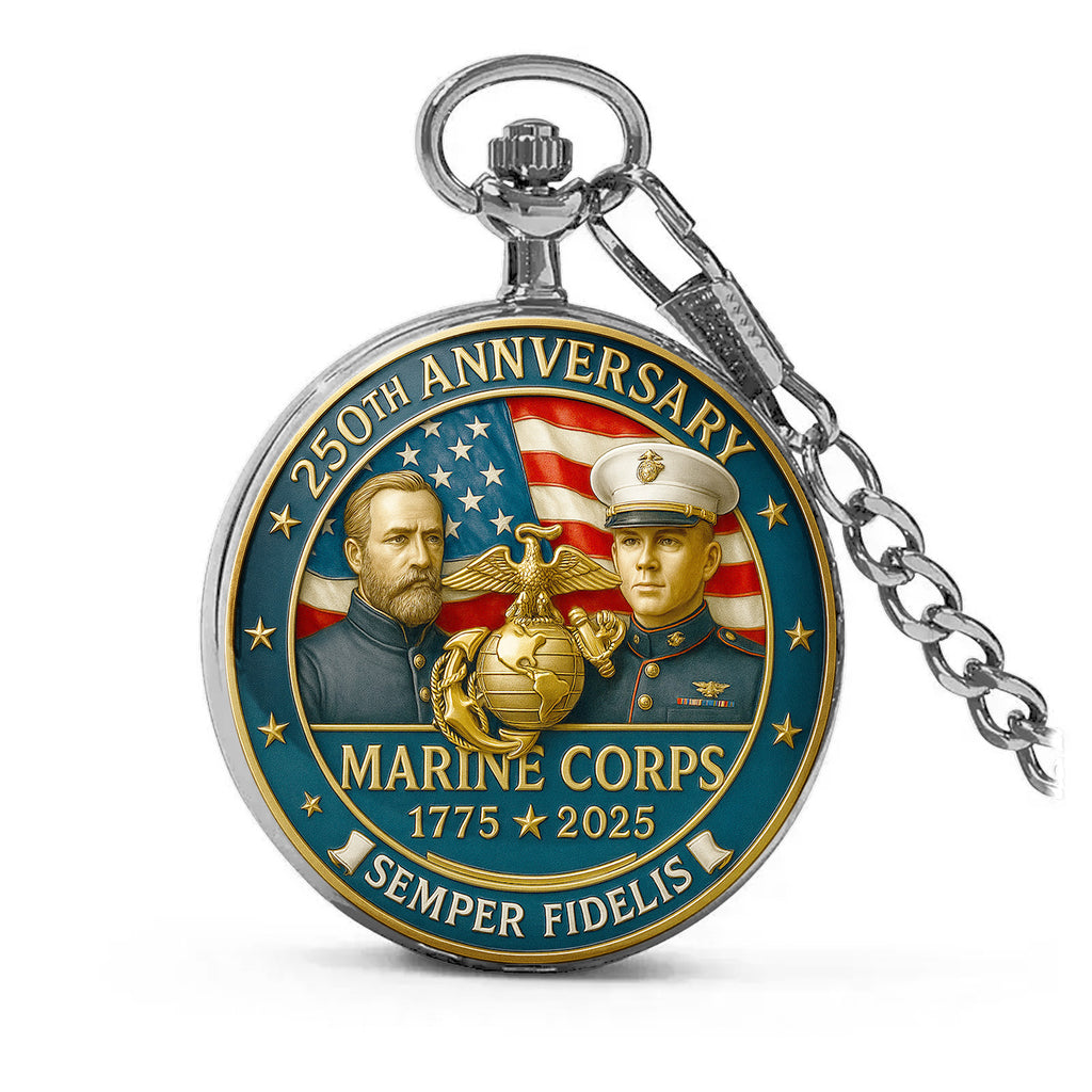 Celebrate 250 years of honor, courage, and commitment with this limited-edition Marine Corps 250th Anniversary Pocket Watch. Featuring a powerful 3D-style printed design of Marines across generations, the Eagle, Globe, and Anchor emblem, and the American flag in the background — this pocket watch is a tribute to every Marine who has ever worn the uniform with pride.