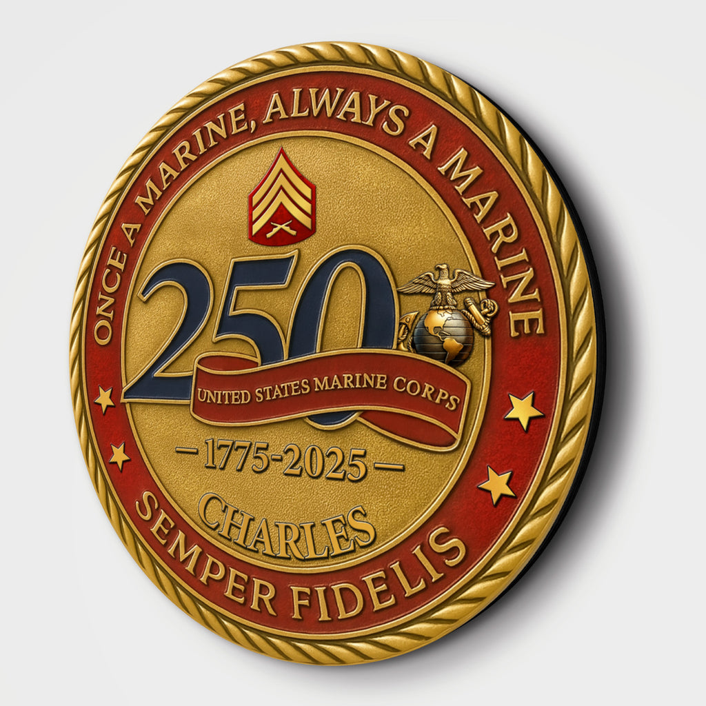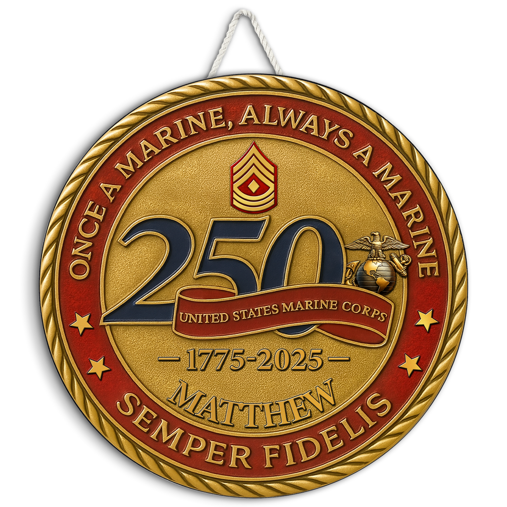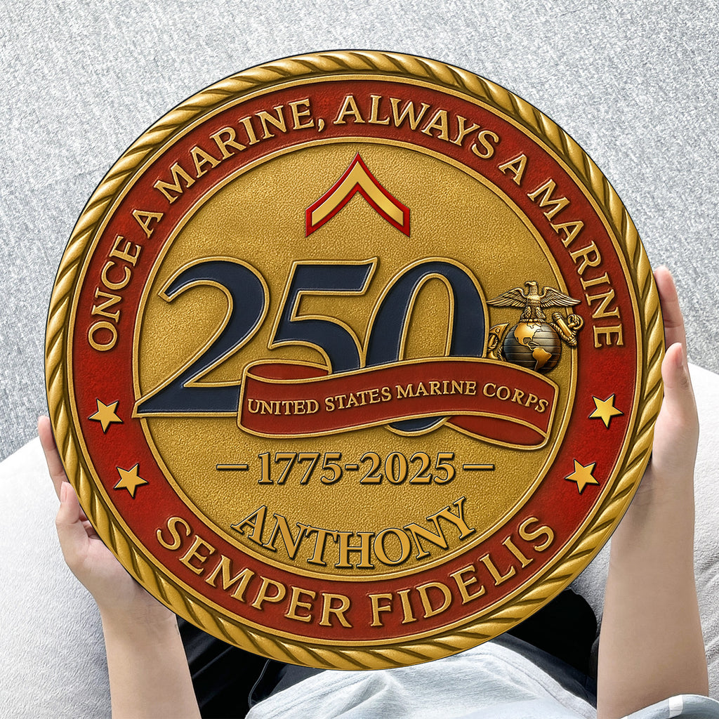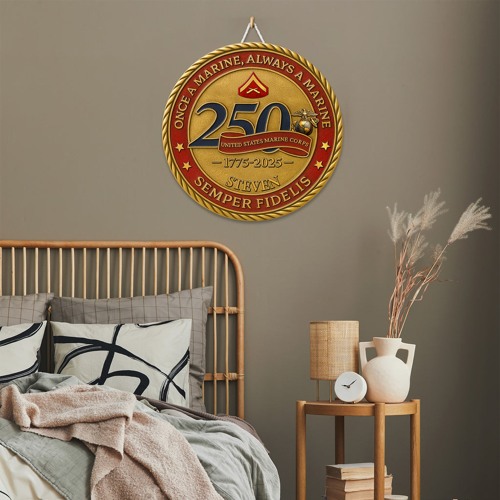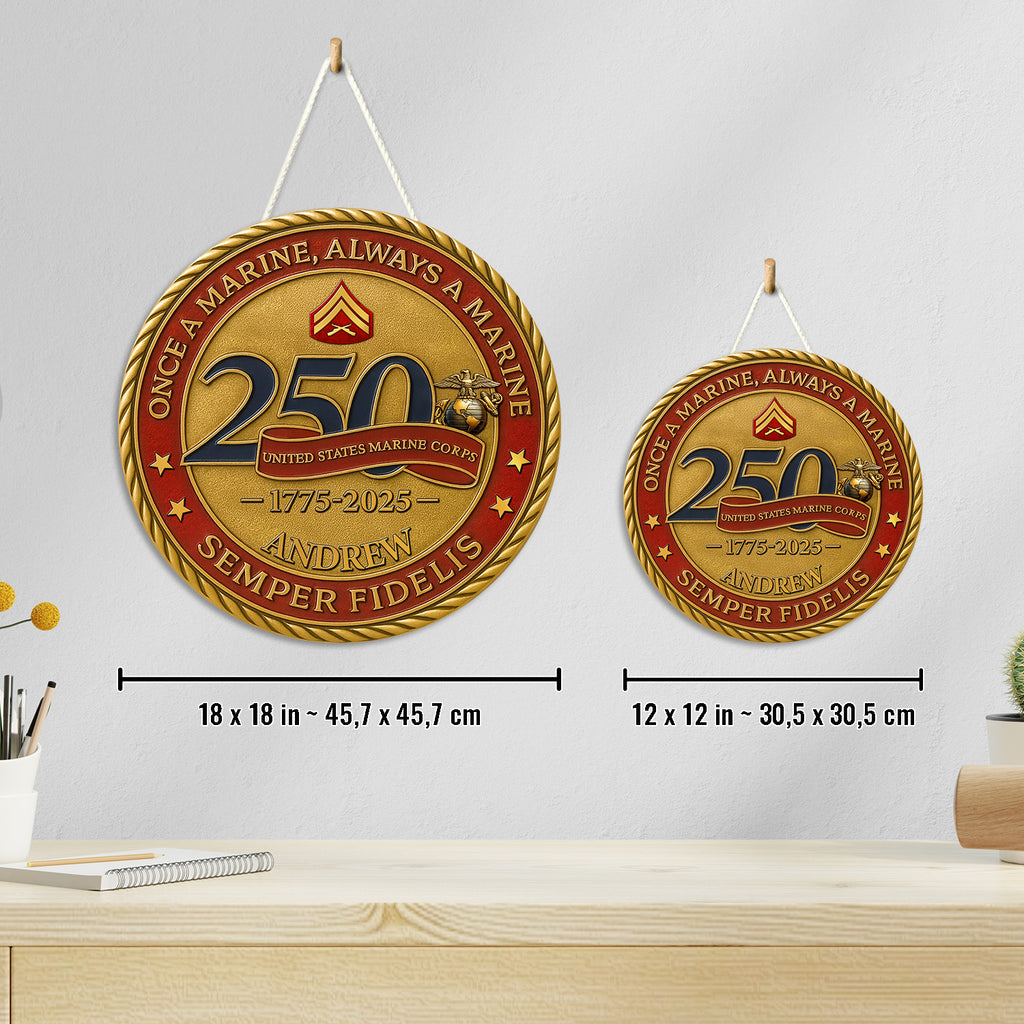 Celebrate 250 years of honor, courage, and unwavering loyalty with this bold MARlNE Corps commemorative wooden sign. Featuring the powerful mottos “Once a MARlNE, Always a MARlNE” and “Semper Fidelis”, this design pays tribute to the eternal brotherhood of the MARlNE Corps.