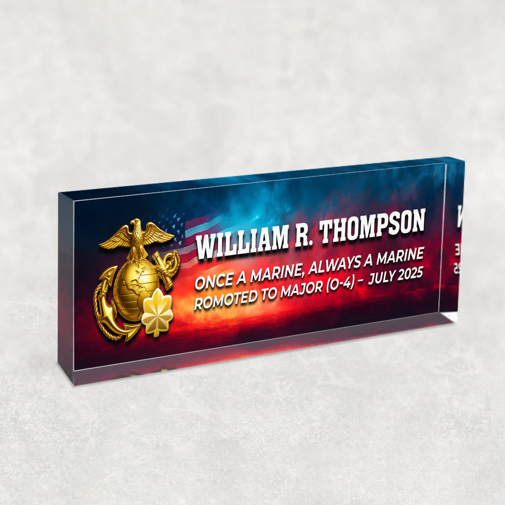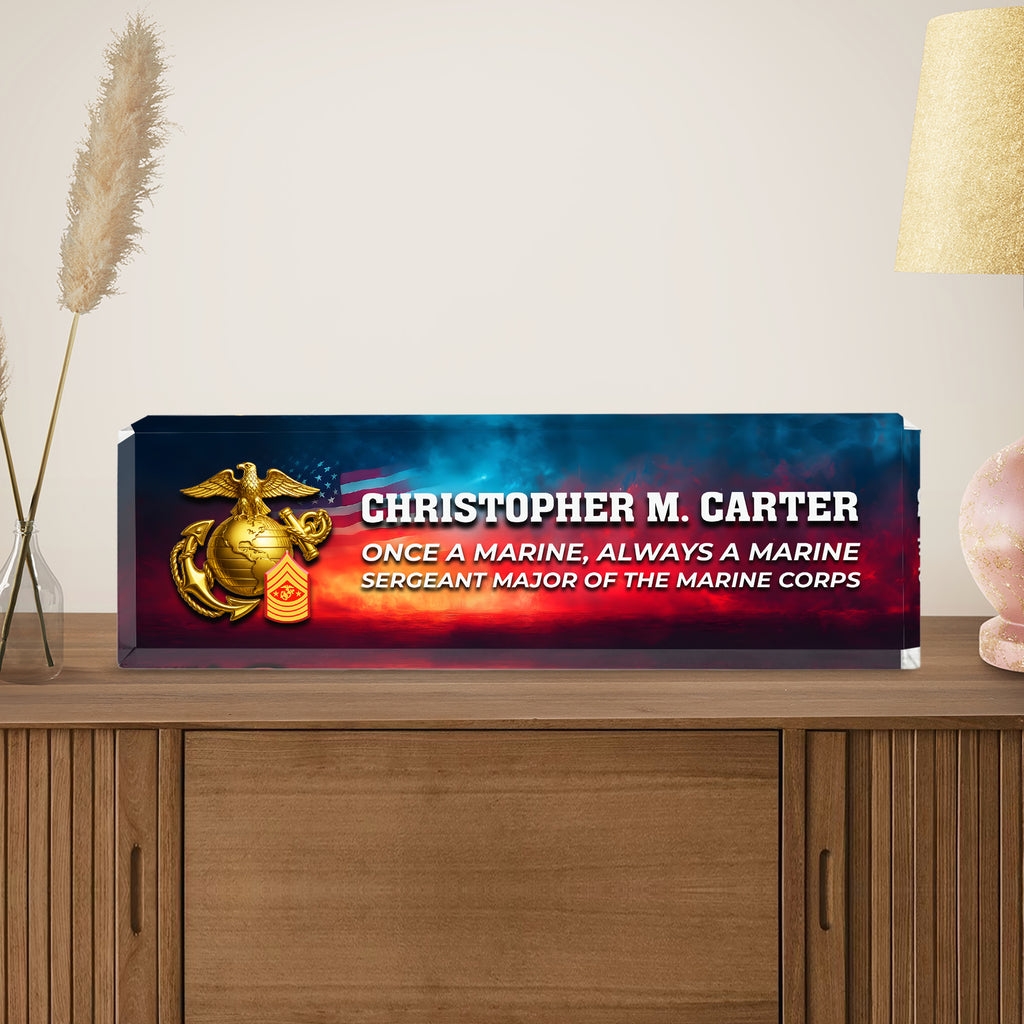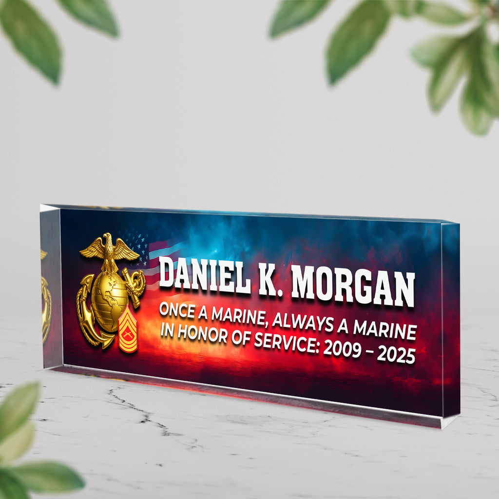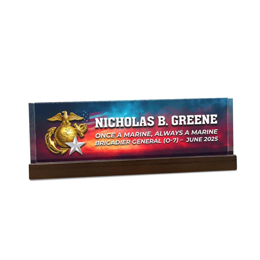 Celebrate the proud tradition of the United States Marine Corps with this bold acrylic desk plaque, perfect for marking a promotion to Brigadier General or other career milestones. The striking sunset backdrop, iconic Eagle, Globe & Anchor emblem, and silver star create a powerful display of honor and achievement. Personalize with any name, rank, and service date to craft a one-of-a-kind keepsake worthy of a Marine’s legacy. Made from durable, crystal-clear acrylic with high-definition printing, it’s designed to inspire pride for years to come.