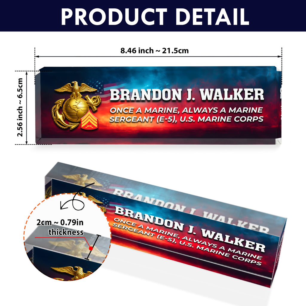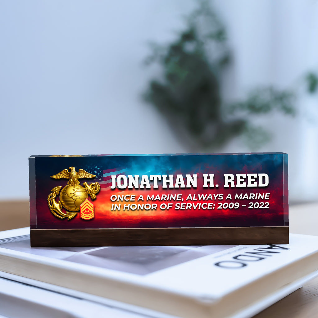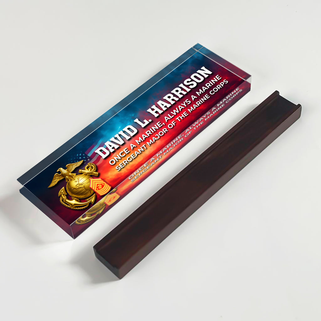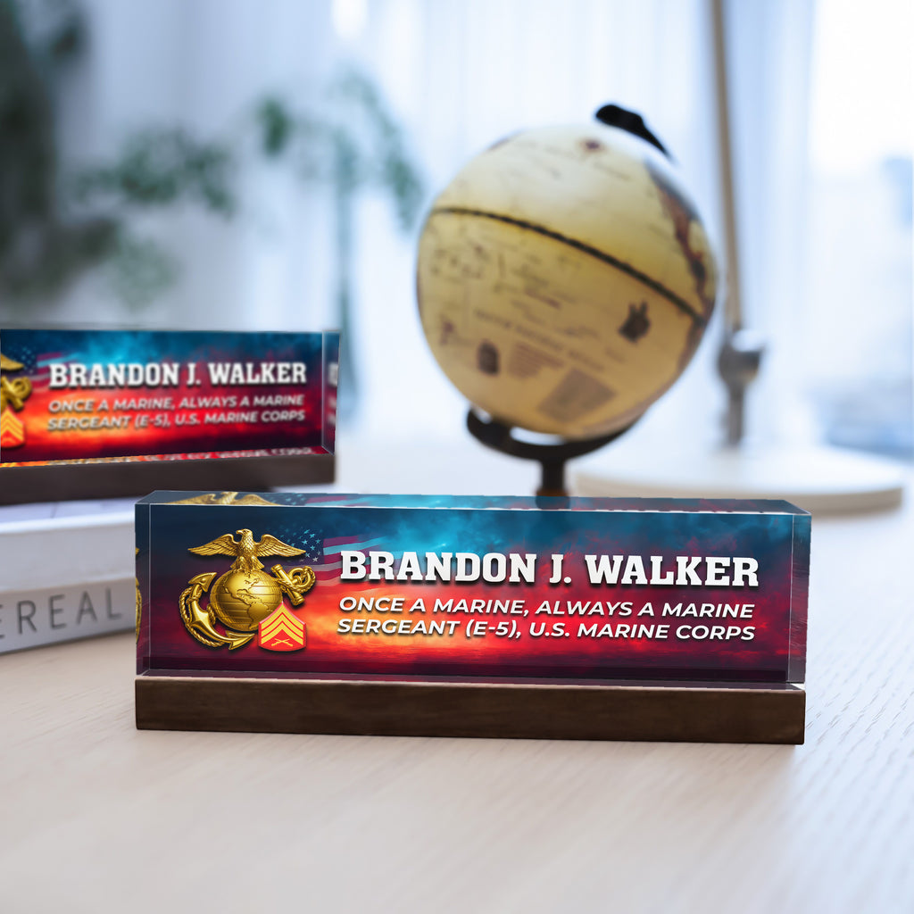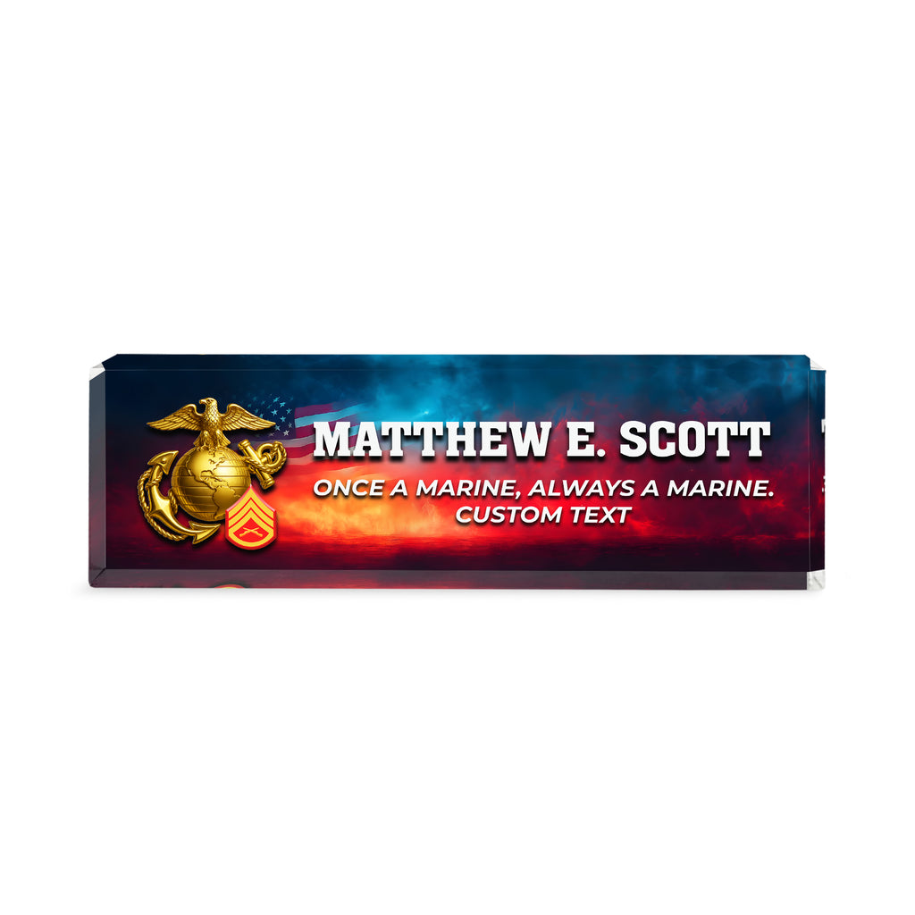 Celebrate the proud tradition of the United States Marine Corps with this bold acrylic desk plaque, perfect for marking a promotion to Brigadier General or other career milestones. The striking sunset backdrop, iconic Eagle, Globe & Anchor emblem, and silver star create a powerful display of honor and achievement. Personalize with any name, rank, and service date to craft a one-of-a-kind keepsake worthy of a Marine’s legacy. Made from durable, crystal-clear acrylic with high-definition printing, it’s designed to inspire pride for years to come.