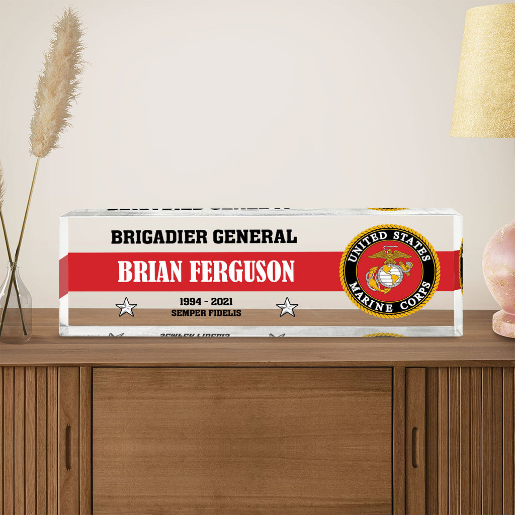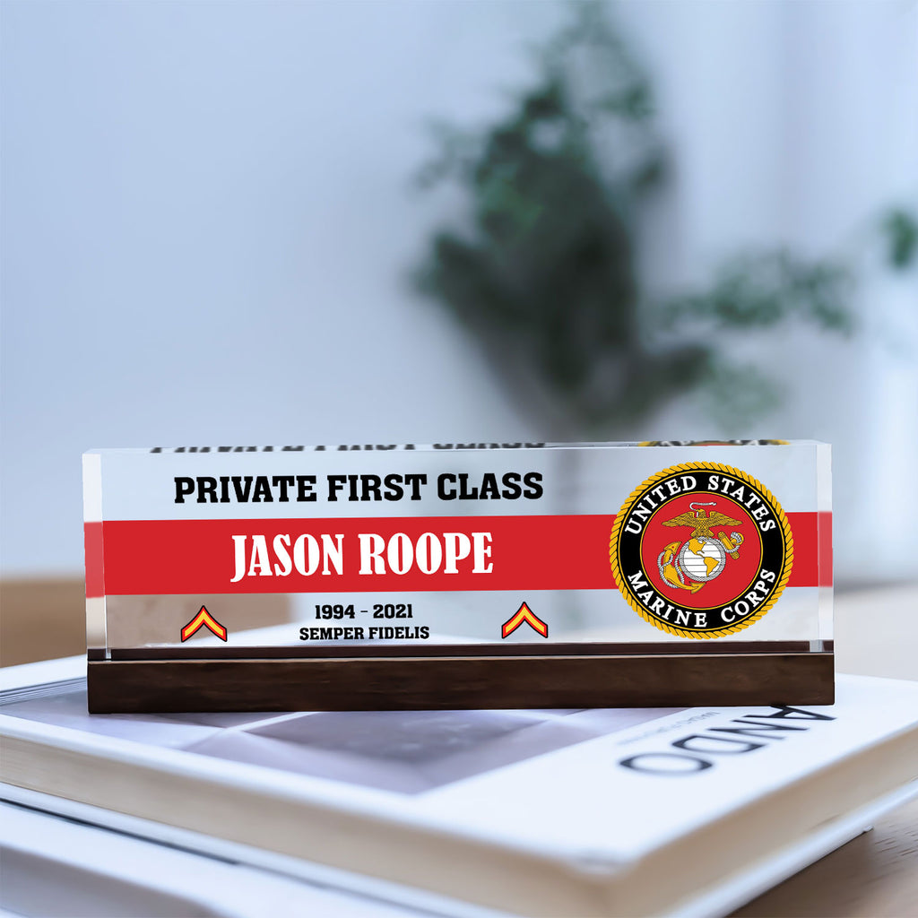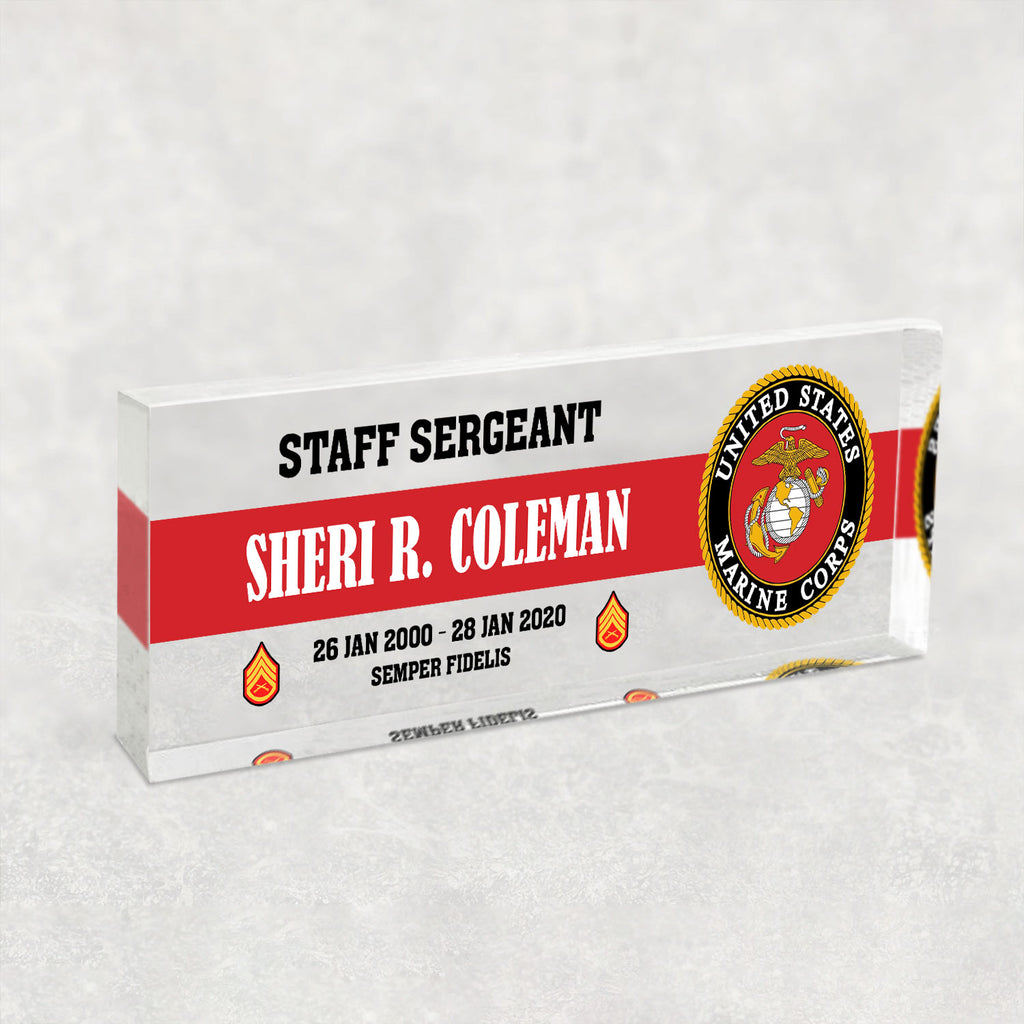 Honor the legacy of the United States Marine Corps with a custom acrylic plaque made for active‑duty Marines, veterans and retirees. Personalize any name, rank and service year to create a distinctive desk display for promotions, retirements or commemorations—especially fitting for the 250th Anniversary of the Marine Corps. Crafted from crystal‑clear acrylic with precision printing, this keepsake delivers a clean, professional look that stands the test of time.