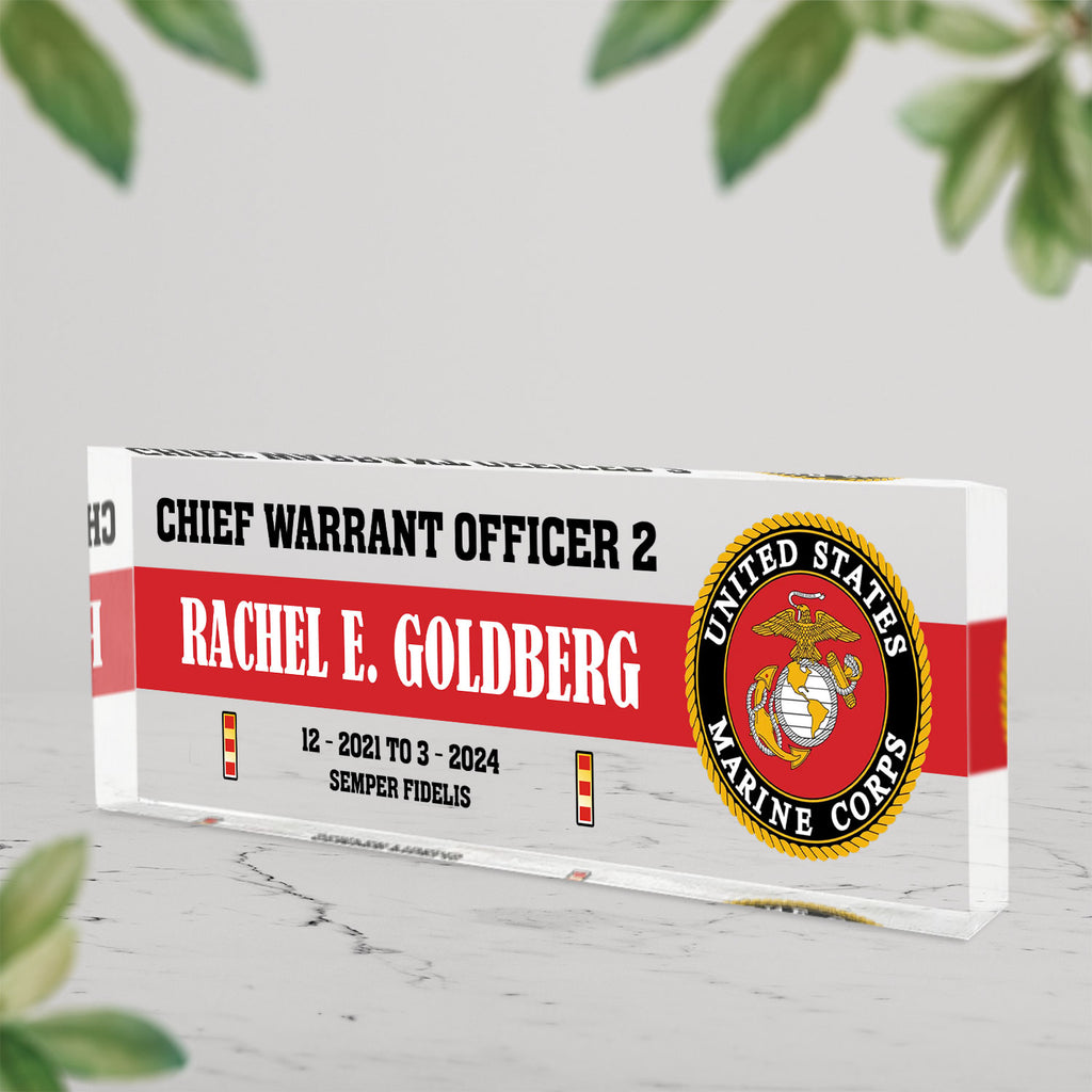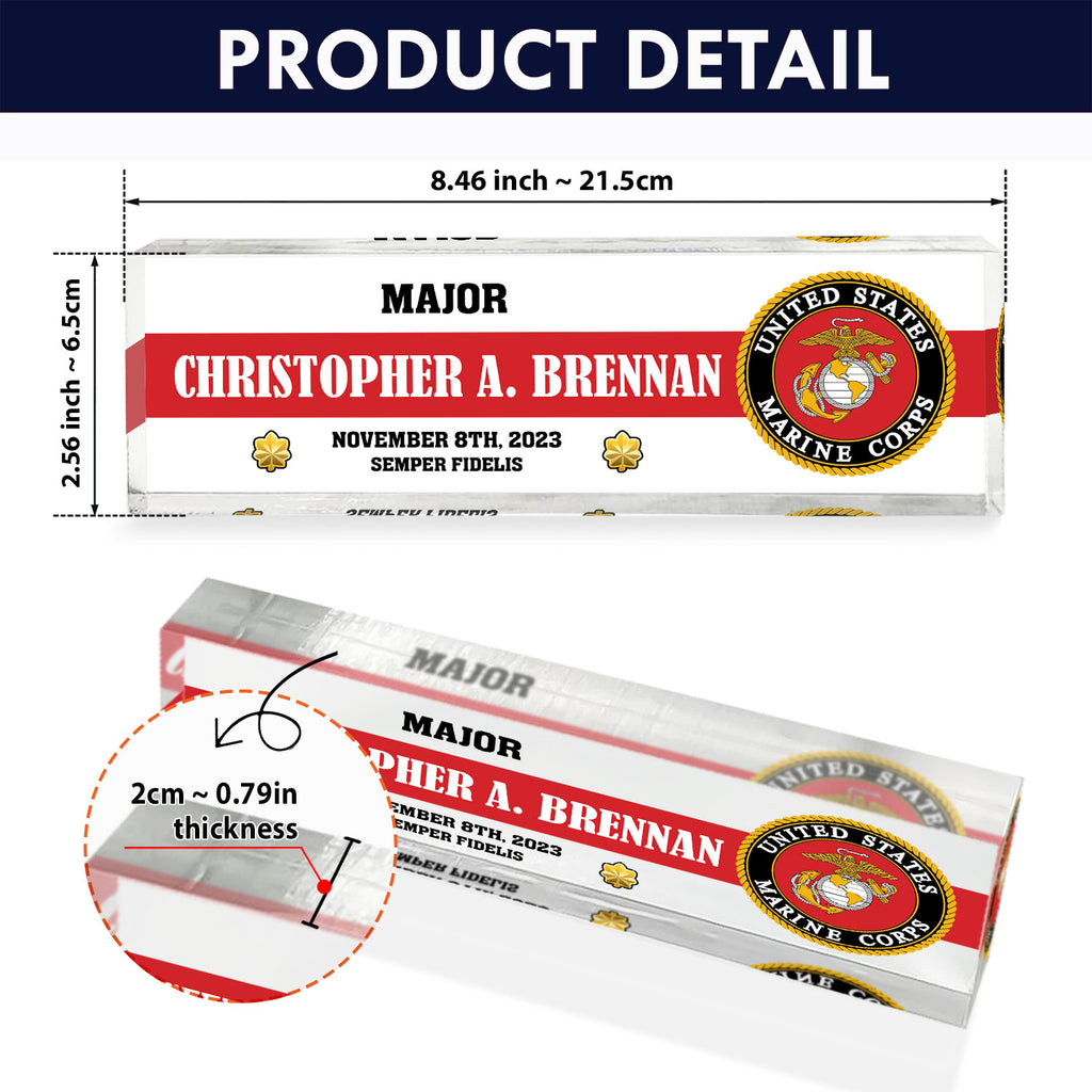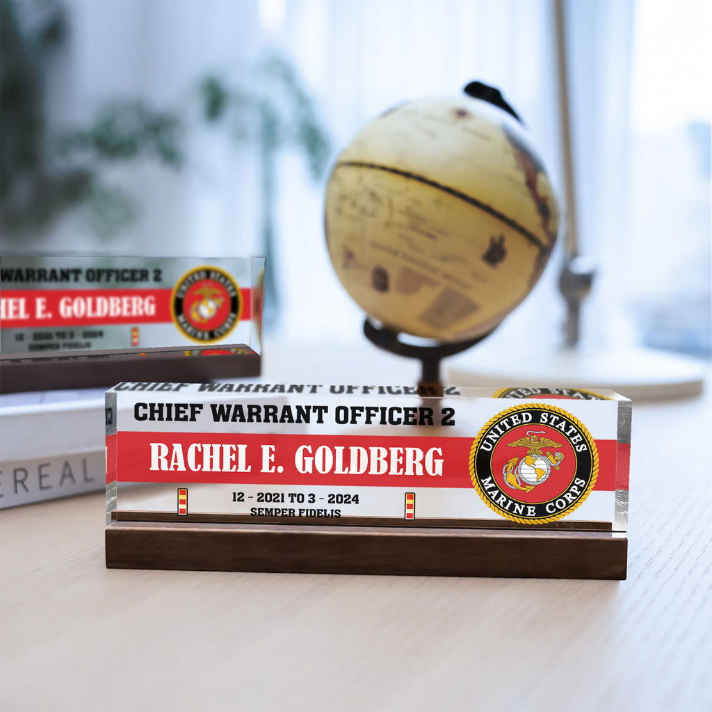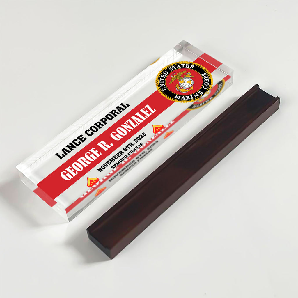Honor the legacy of the United States Marine Corps with a custom acrylic plaque made for active‑duty Marines, veterans and retirees. Personalize any name, rank and service year to create a distinctive desk display for promotions, retirements or commemorations—especially fitting for the 250th Anniversary of the Marine Corps. Crafted from crystal‑clear acrylic with precision printing, this keepsake delivers a clean, professional look that stands the test of time.