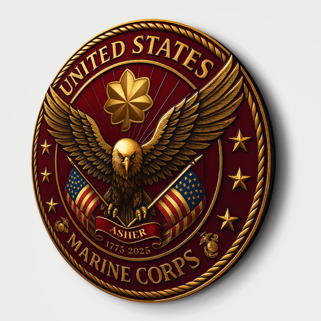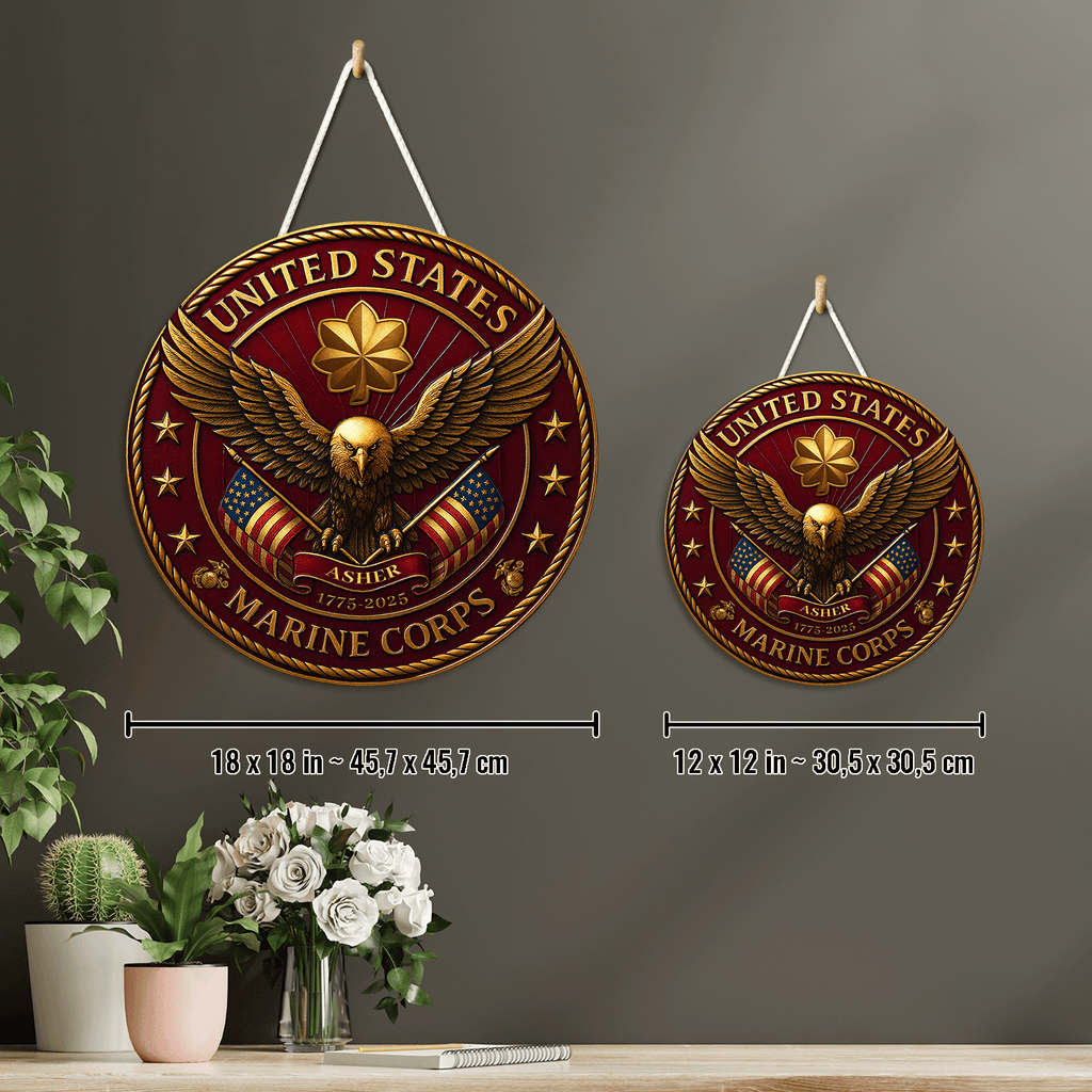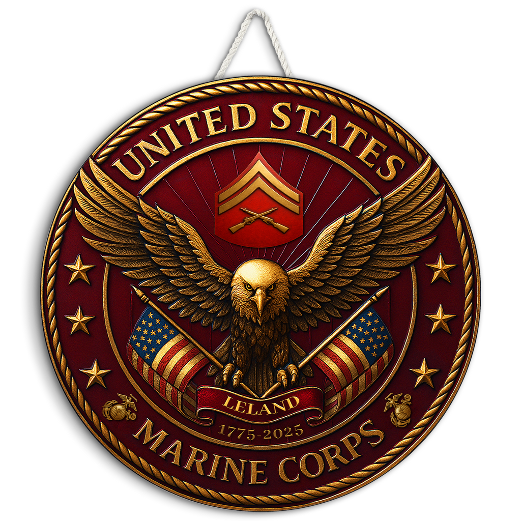Celebrate the legacy, strength, and honor of the MARlNE Corps with this striking round wooden sign — a tribute to 250 years of Semper Fidelis spirit. At the heart of the design is a bold American bald eagle, wings fully spread, perched over crossed flags and a customizable name banner.