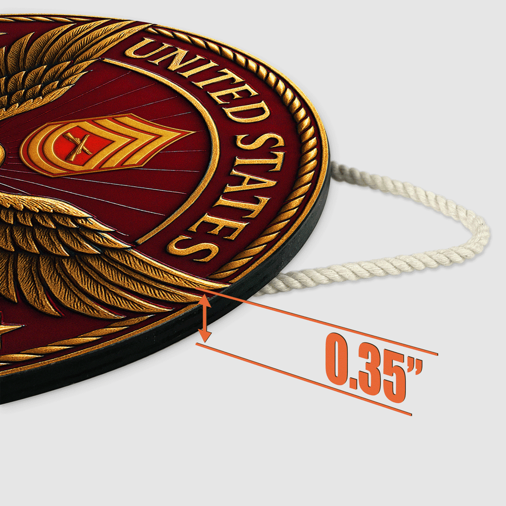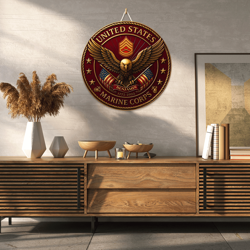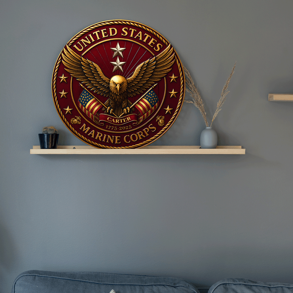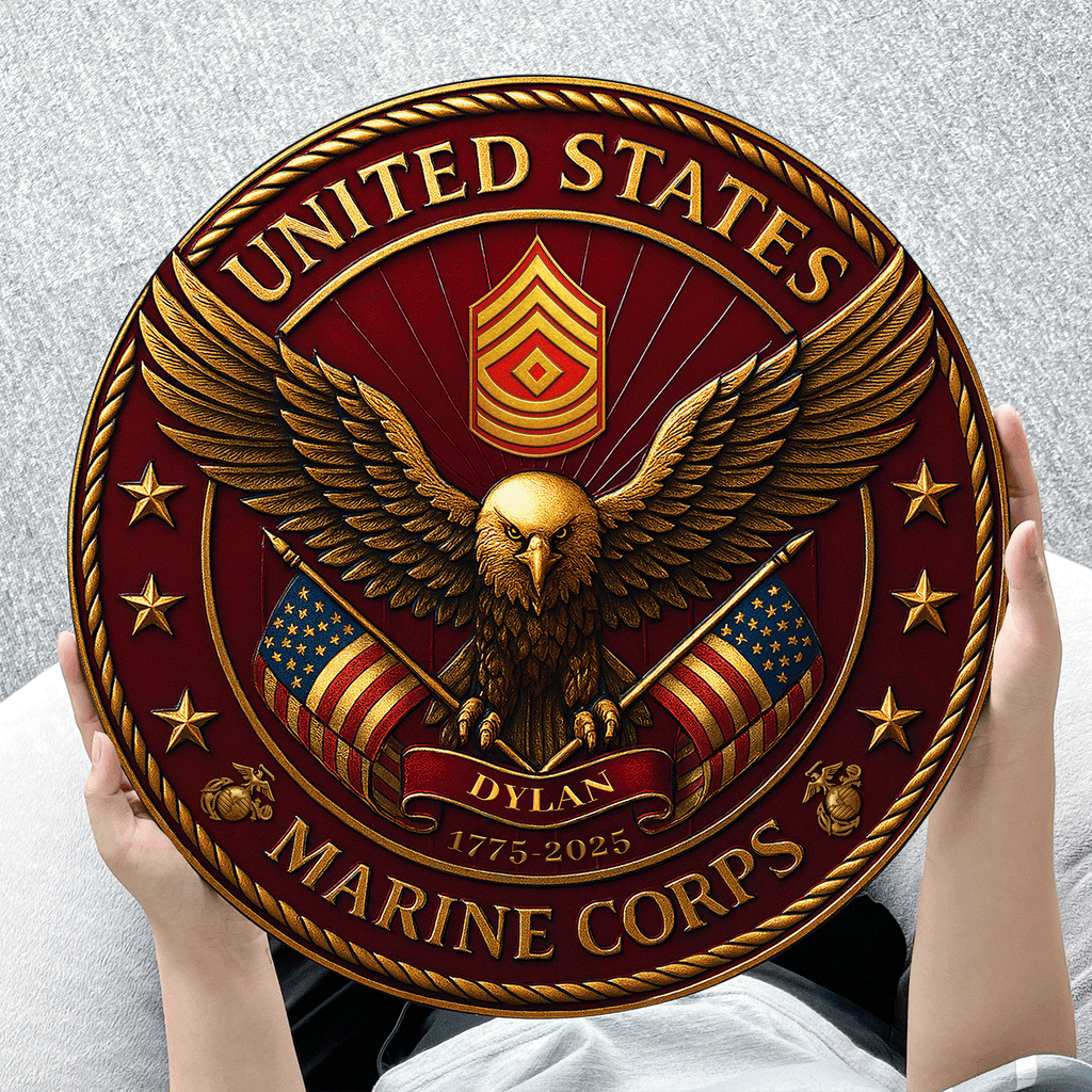 Celebrate the legacy, strength, and honor of the MARlNE Corps with this striking round wooden sign — a tribute to 250 years of Semper Fidelis spirit. At the heart of the design is a bold American bald eagle, wings fully spread, perched over crossed flags and a customizable name banner.
