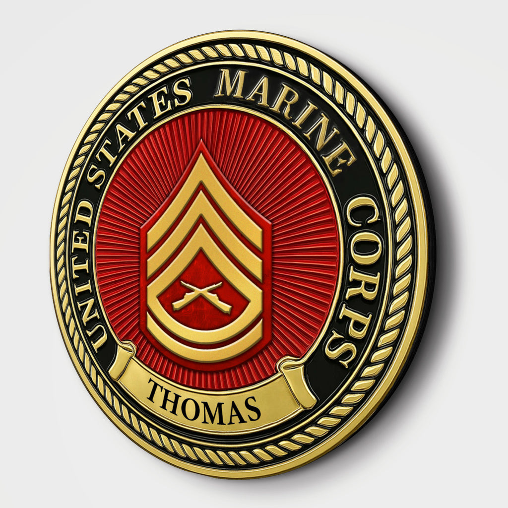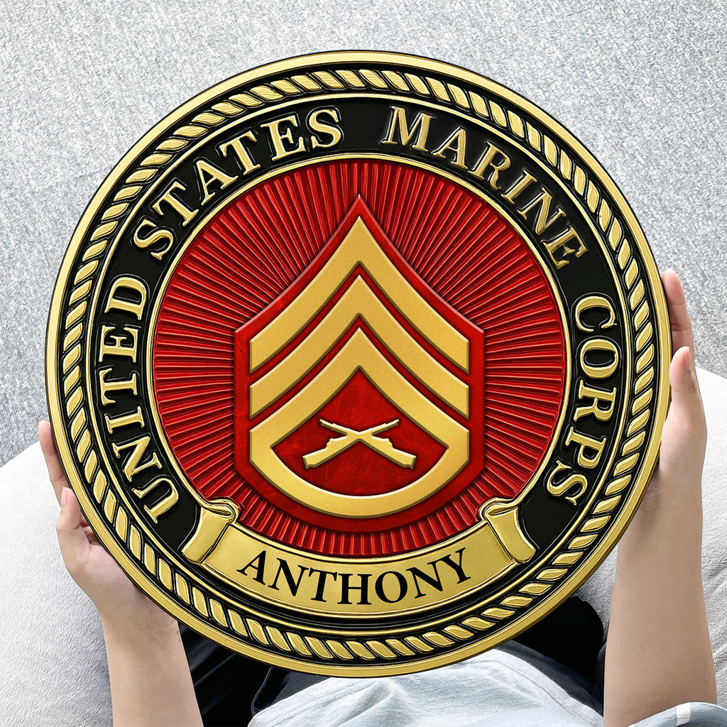 Surrounding the insignia is a bold gold-outlined border engraved with “United States MARlNE Corps”, while the banner below highlights your hero’s name, making this a truly personal and meaningful tribute.