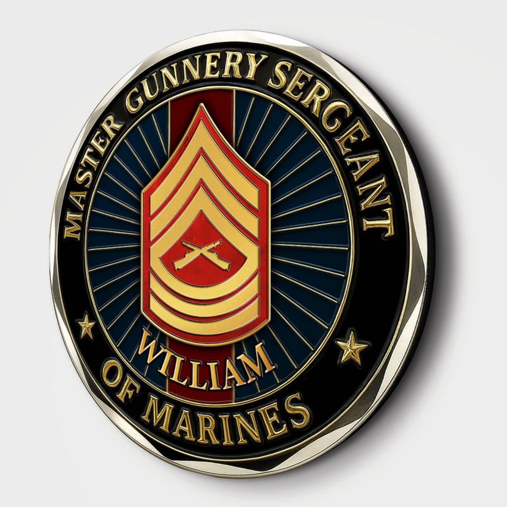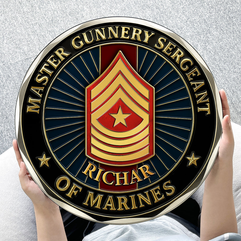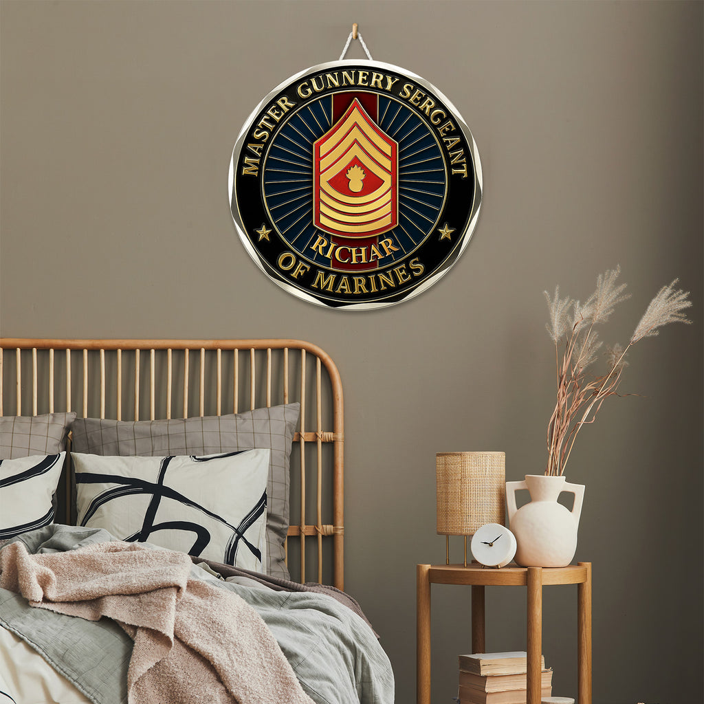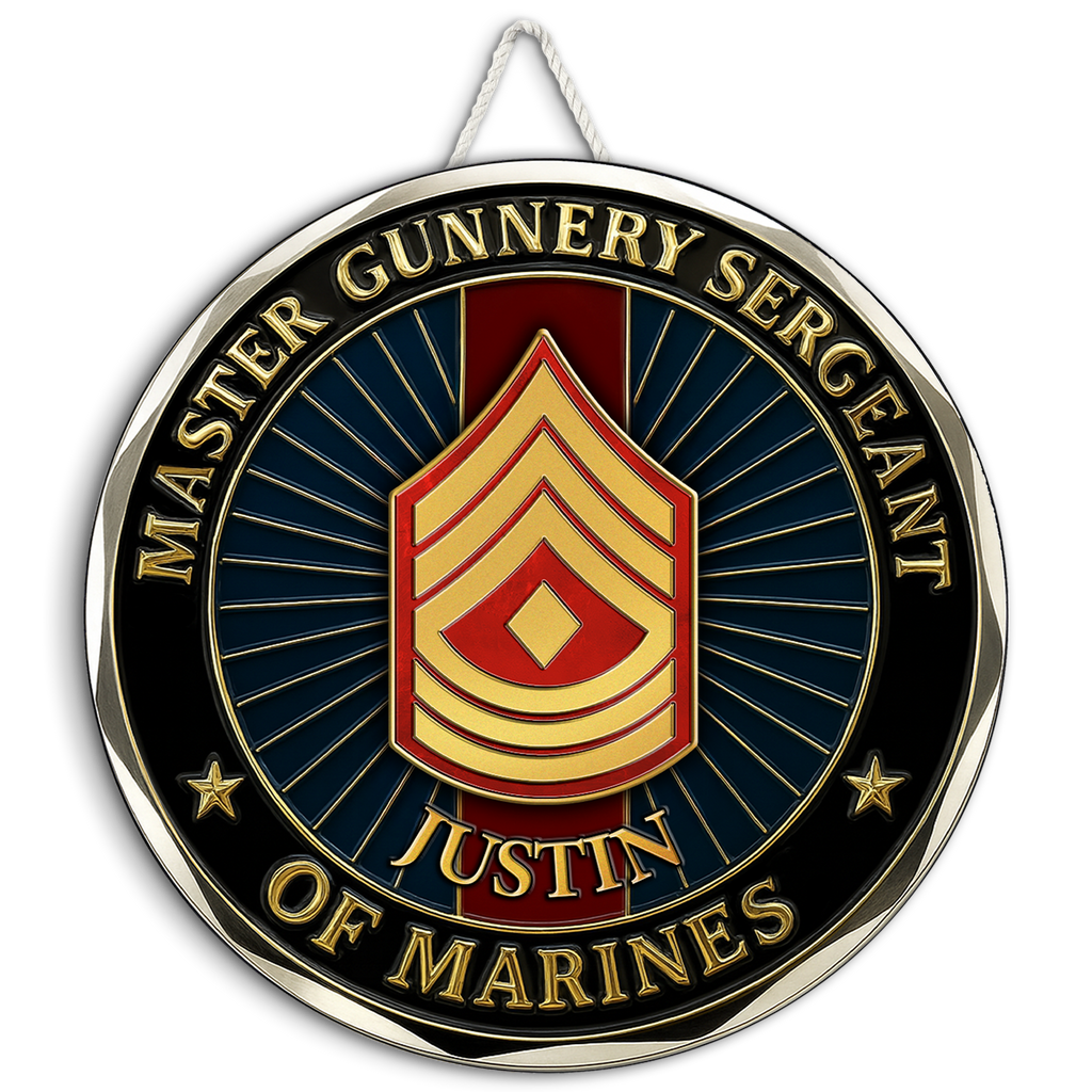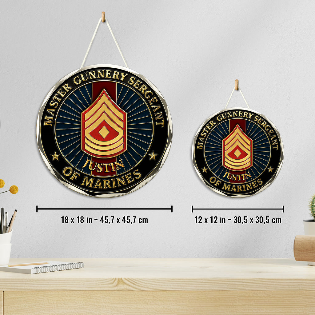 Honor your MARlNE’s service and legacy with this powerful personalized round wooden sign — featuring custom rank and name proudly displayed at the center. Whether it's Master Gunnery Sergeant, Sergeant, or any other rank, this piece transforms into a one-of-a-kind tribute tailored just for your hero.