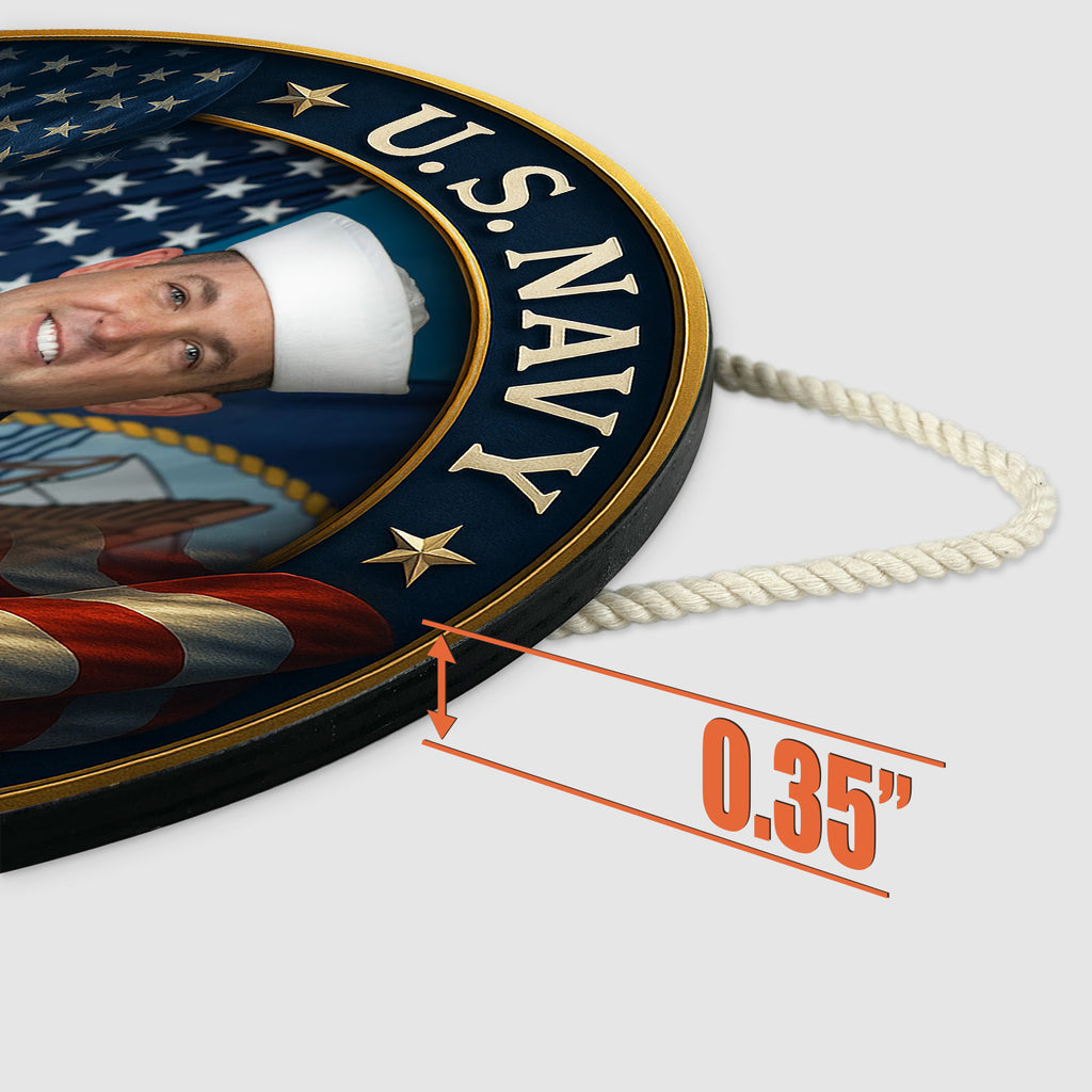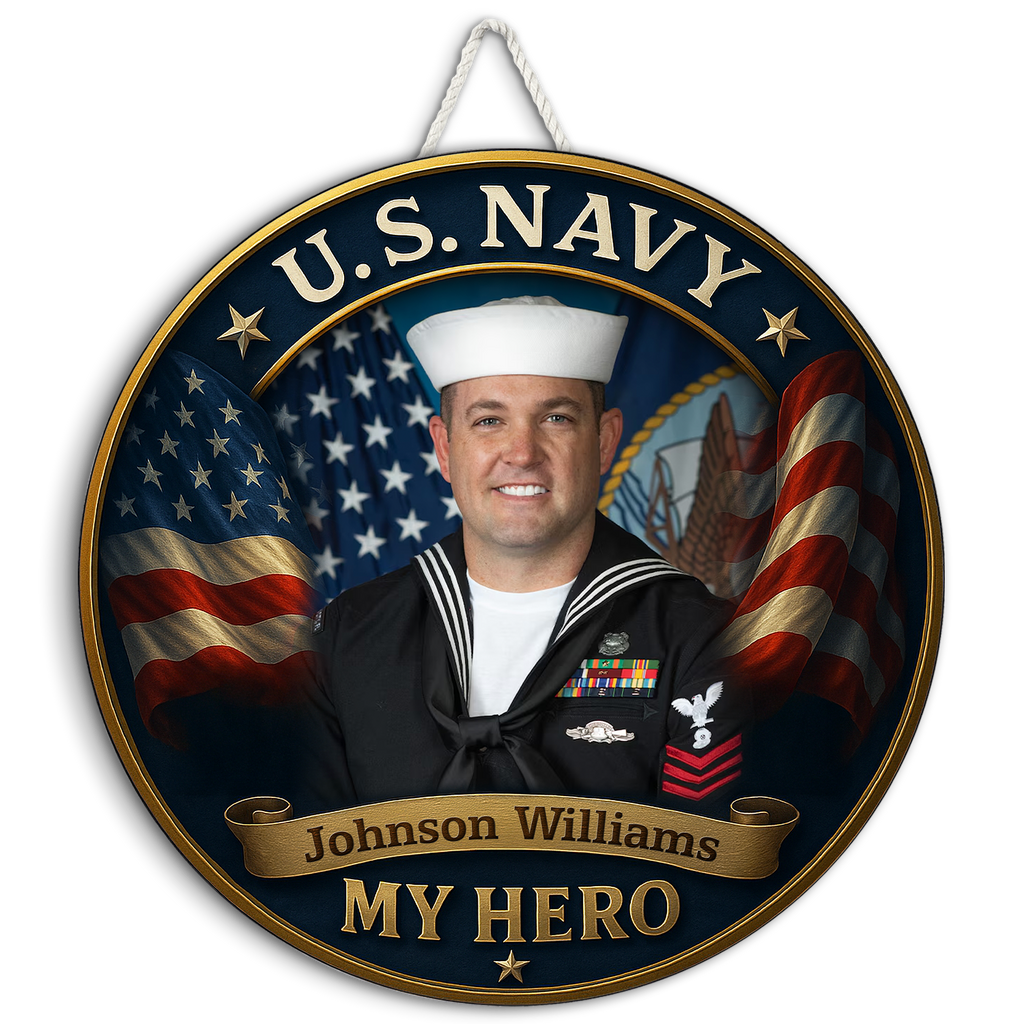 Your hero’s photo and name are beautifully integrated into the layout, making this sign a meaningful tribute for active-duty sailors, veterans, or retirees. The deep blue background, patriotic flags, and gold accents frame their service with the respect it deserves.