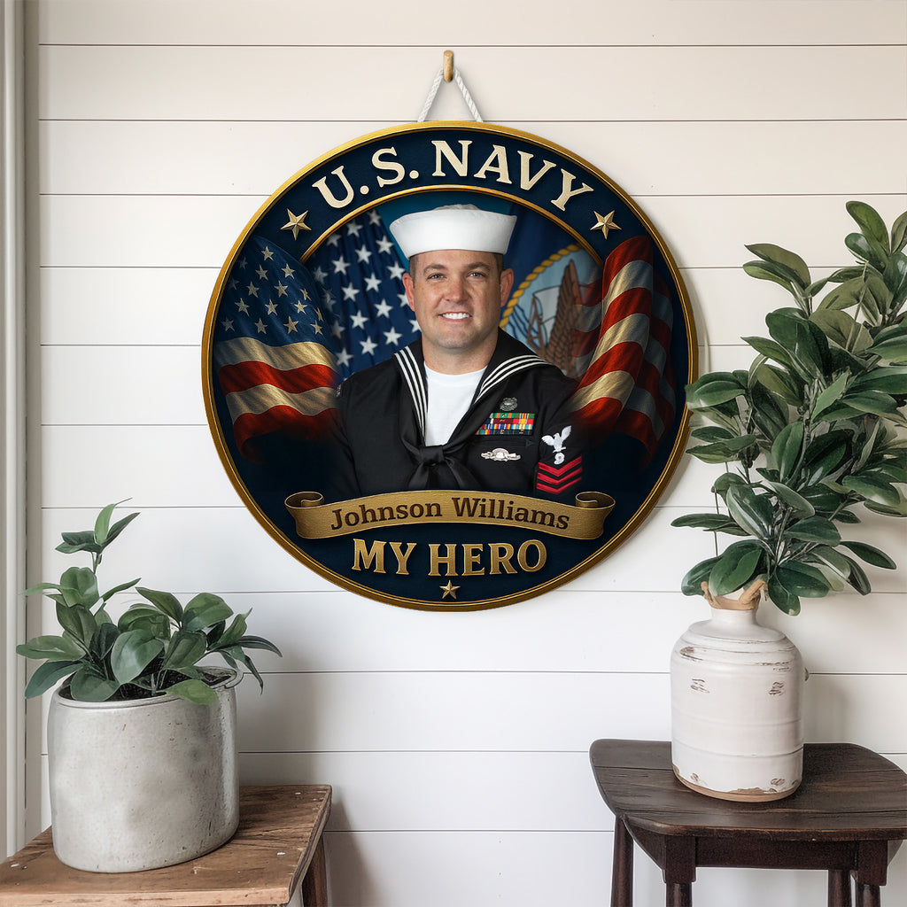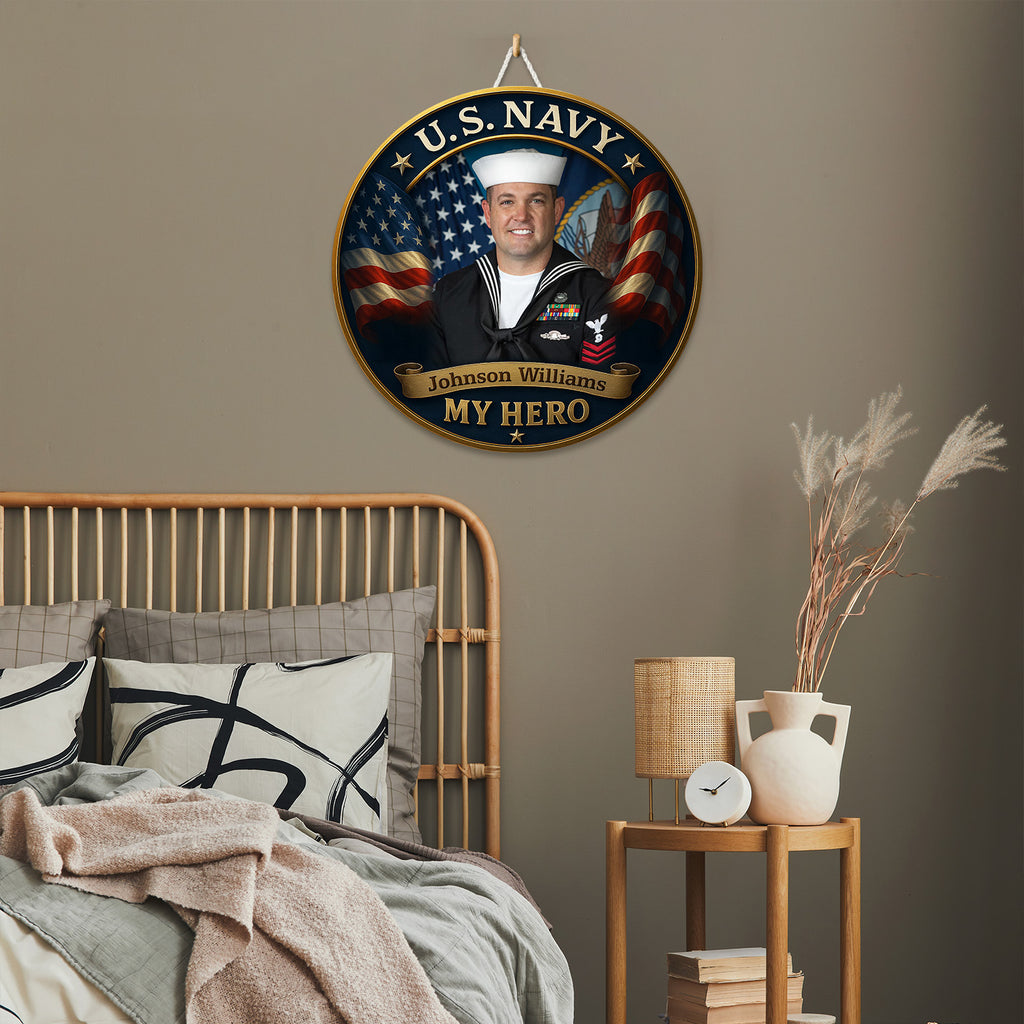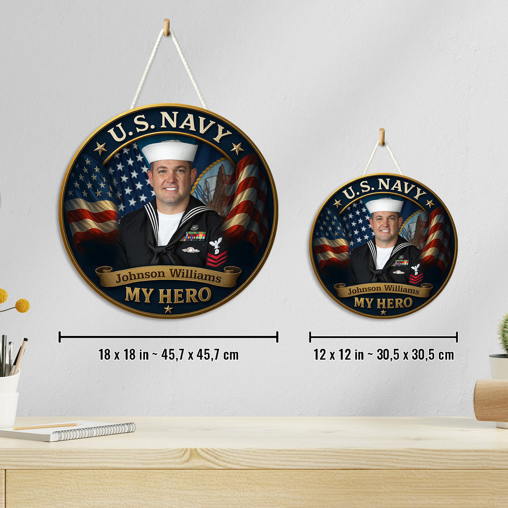 Celebrate your Navy hero with this personalized round wooden sign, featuring a proud sailor portrait surrounded by the stars and stripes. This striking design captures the strength and honor of the U.S. Navy, paired with the heartfelt message: “My Hero.”