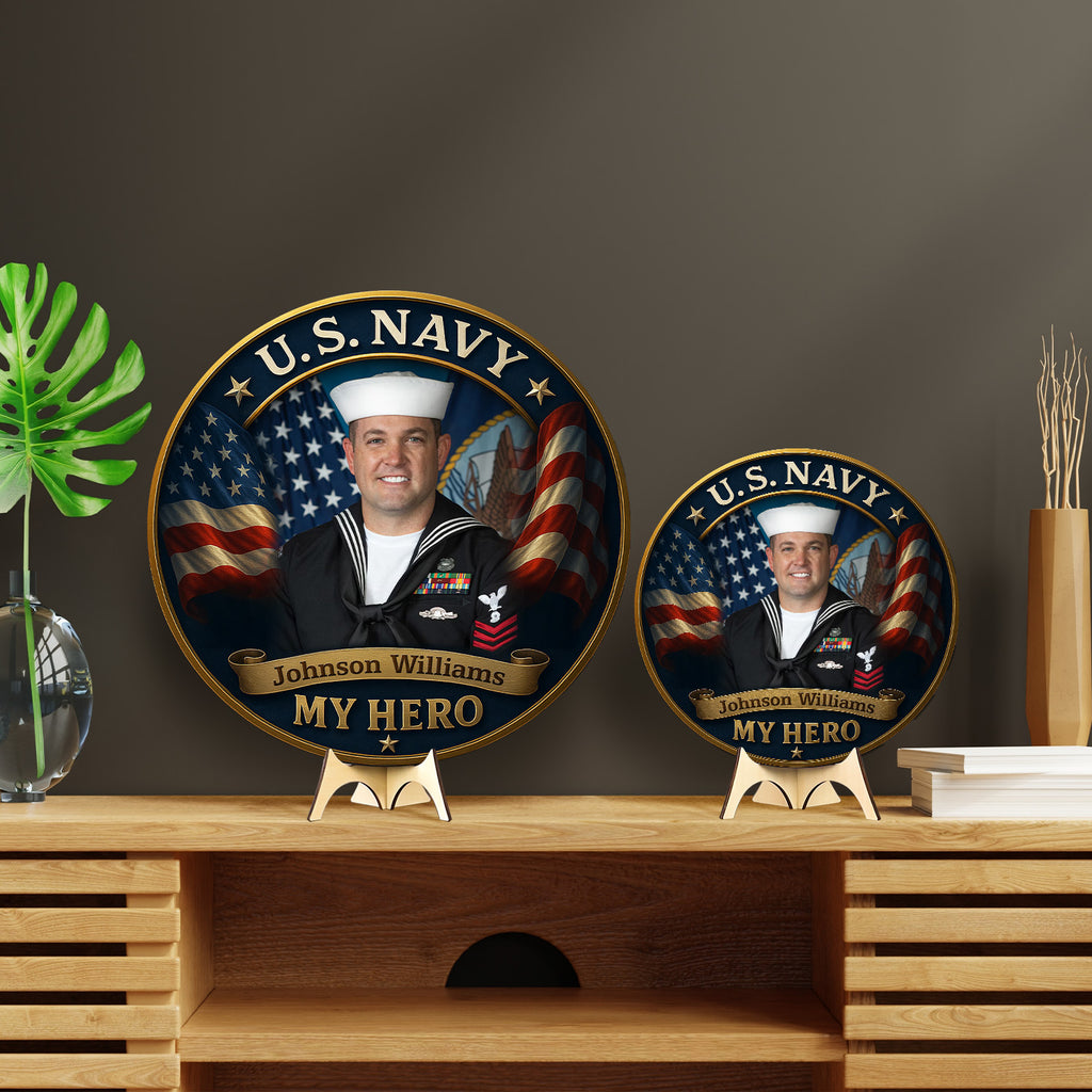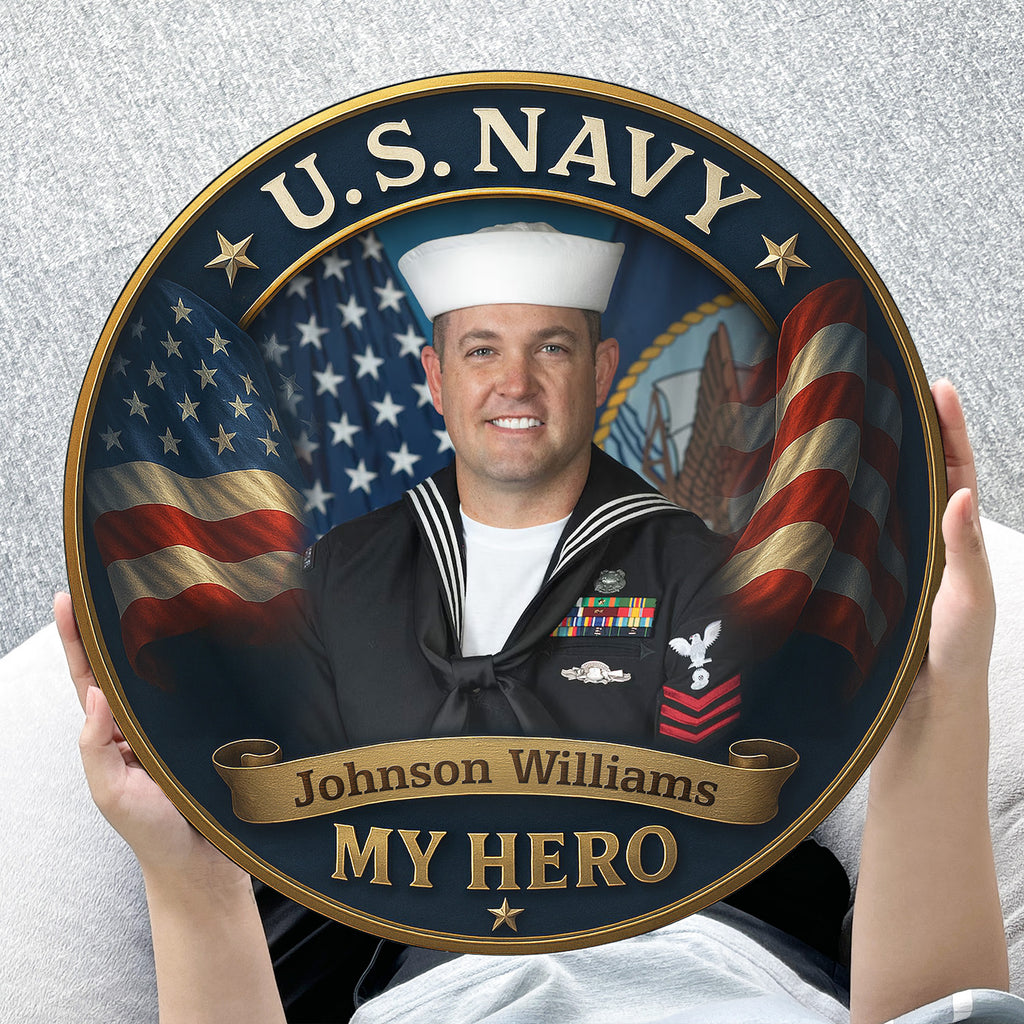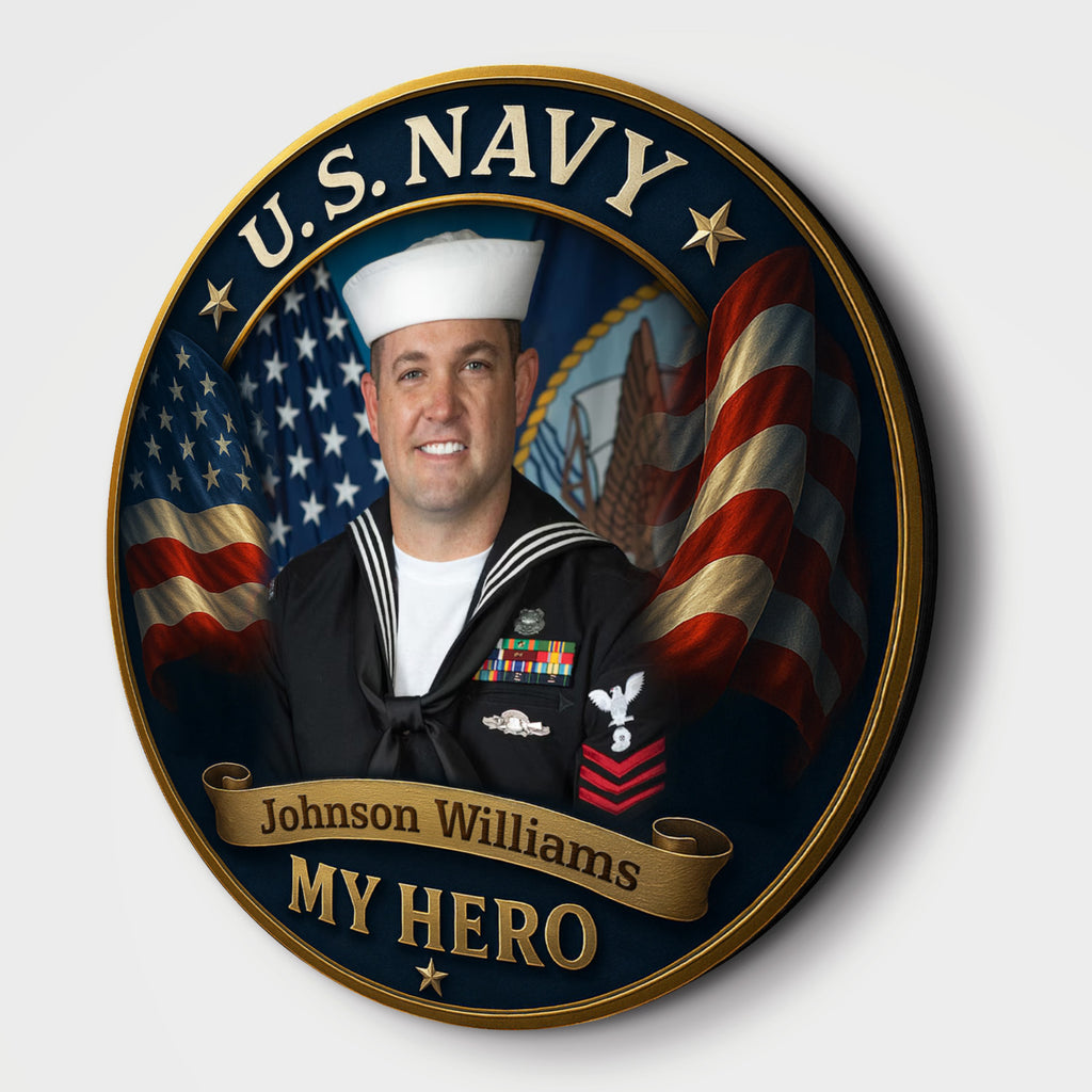 Celebrate your Navy hero with this personalized round wooden sign, featuring a proud sailor portrait surrounded by the stars and stripes. This striking design captures the strength and honor of the U.S. Navy, paired with the heartfelt message: “My Hero.”