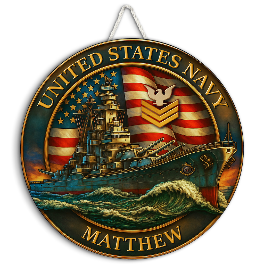 Command attention with this powerful U.S. Navy Battleship Round Sign, featuring a detailed warship cutting through the waves beneath a proud American flag. The centerpiece is a customizable rank badge and the Sailor's name — making this sign a unique tribute to naval service and courage.