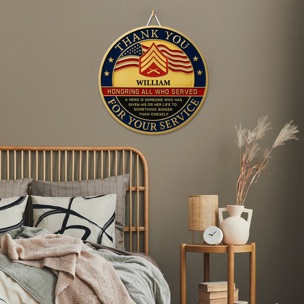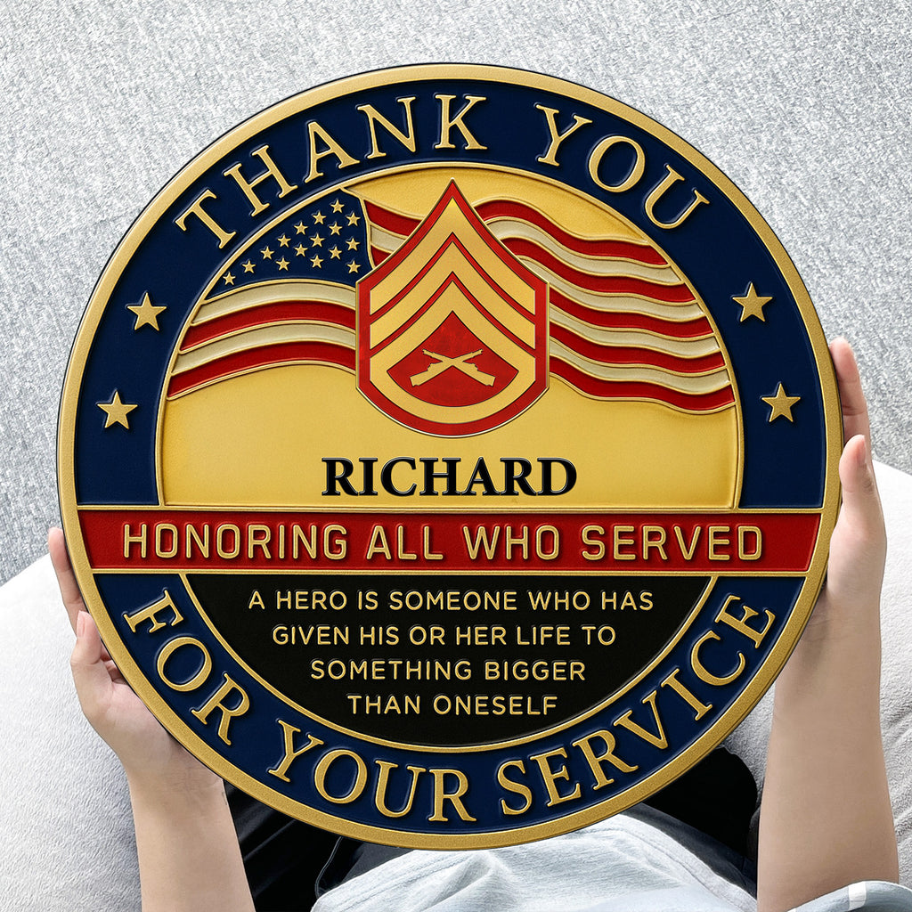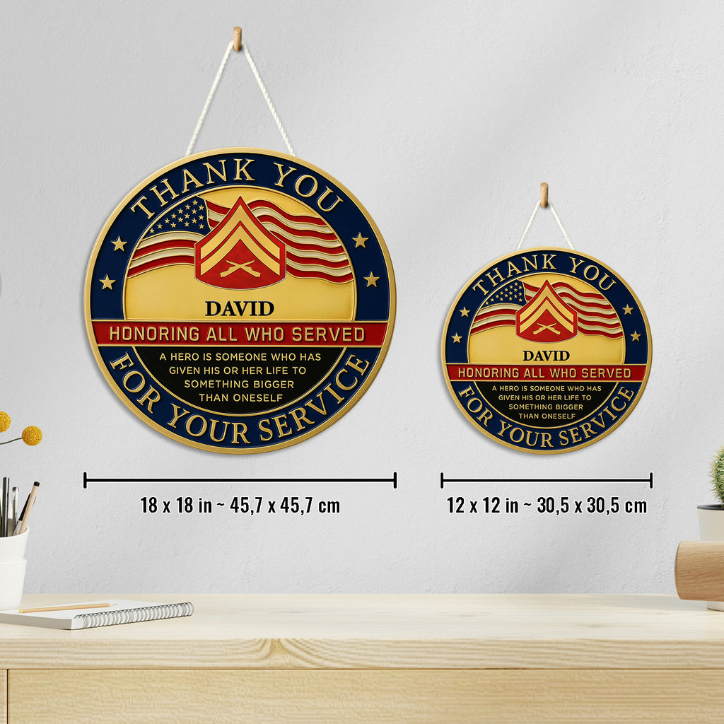 Honor the unwavering courage and service of your beloved Marine with this powerful personalized USMC round wooden sign. Featuring a waving American flag, a bold red Marine Corps chevron insignia, and customizable name area, this piece is designed to recognize and remember those who have given so much for something greater than themselves.