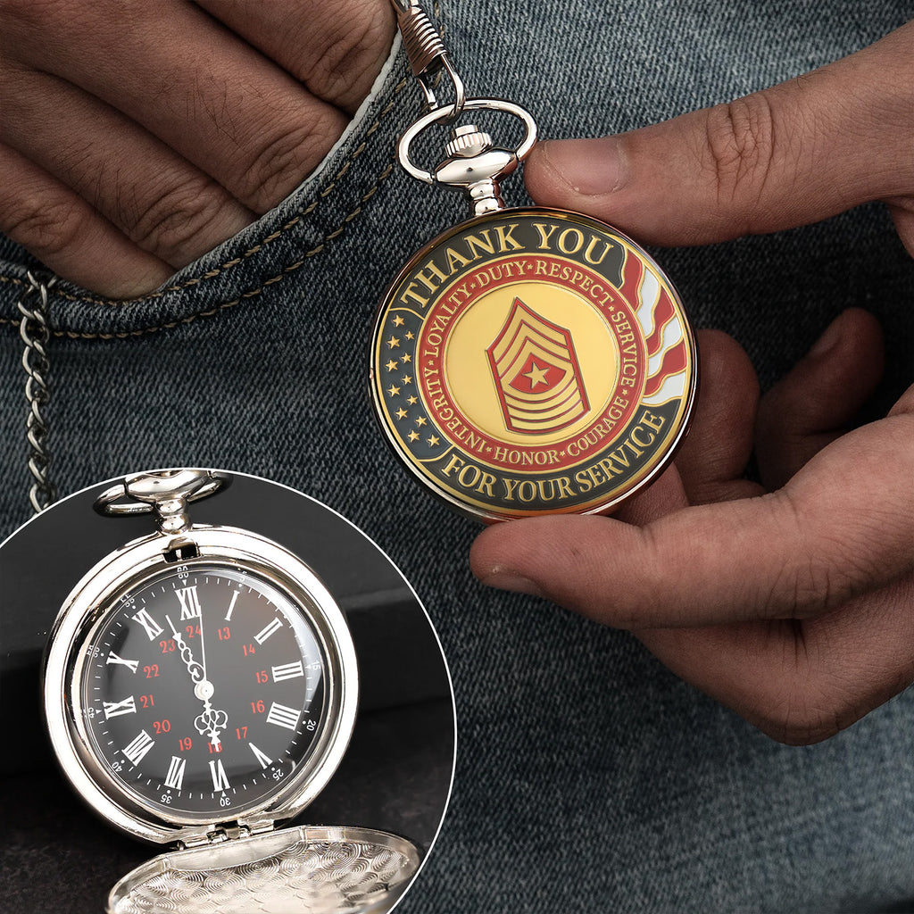 Honor the dedication and sacrifice of a United States Marine with this meaningful “Thank You for Your Service” Pocket Watch. Designed especially for USMC veterans and active-duty Marines, this timepiece features a bold 3D-style printed Marine Corps rank insignia at the center, surrounded by powerful core values: Integrity, Loyalty, Duty, Respect, Service, Honor, and Courage. The background proudly displays the American flag — a lasting symbol of freedom and faithfulness.