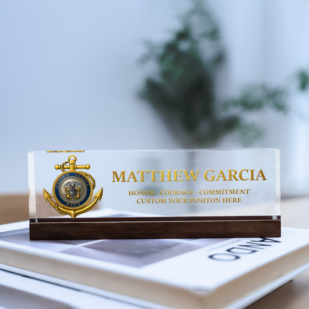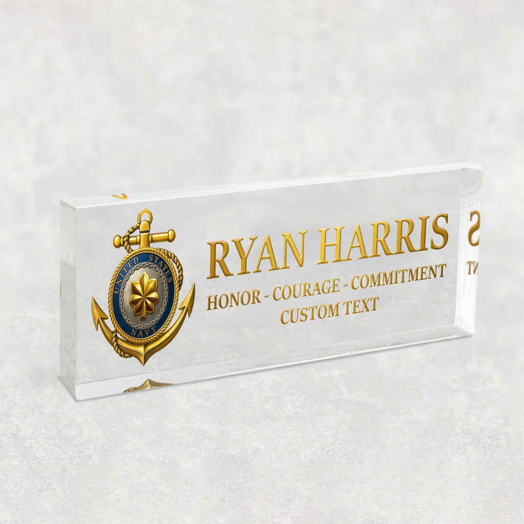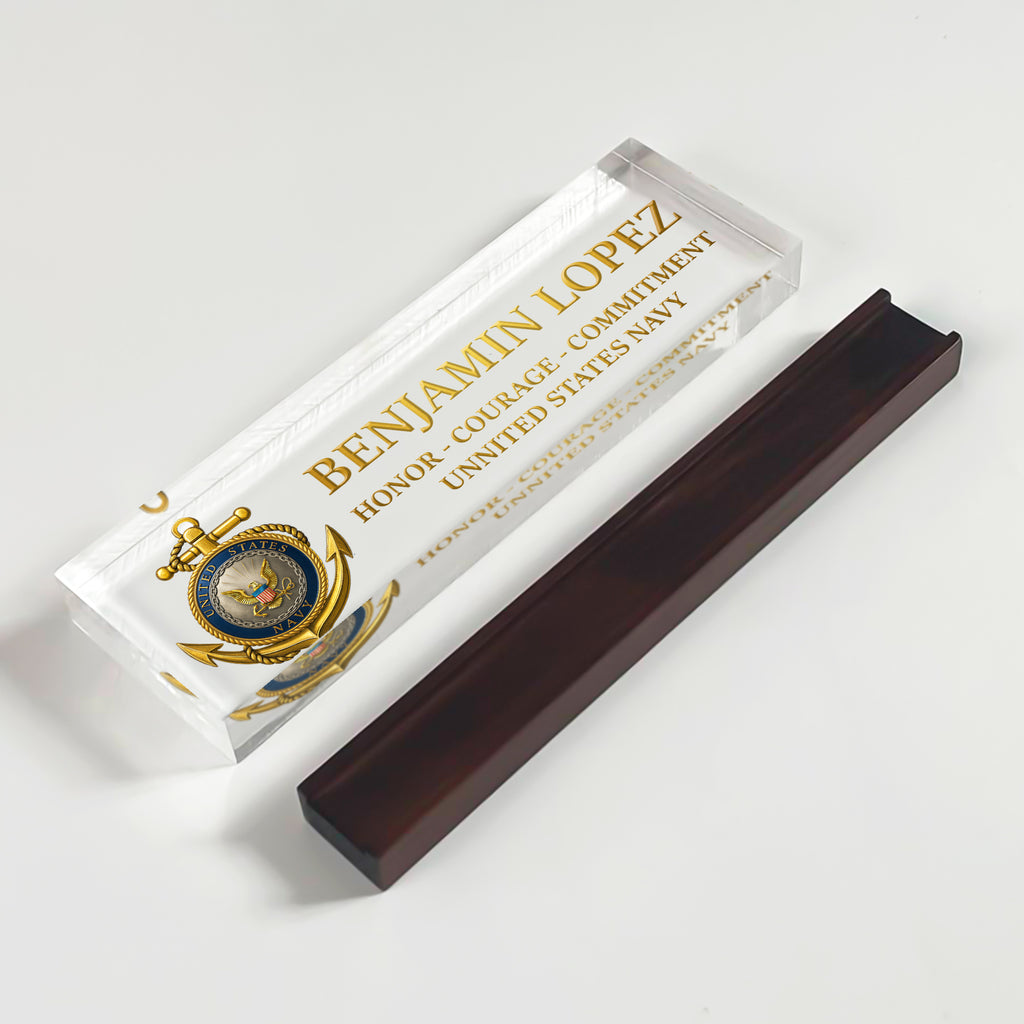 Honor the proud tradition of the United States Navy with this custom acrylic nameplate plaque, designed for active-duty sailors, veterans, and retirees. Personalize it with any name, rank, and service year to create a one-of-a-kind keepsake worthy of display. The refined design makes it ideal for promotions, retirements, or as a highlight piece for the 250th Anniversary of the US Navy. Made from durable, crystal-clear acrylic and printed with vivid detail, this plaque stands as a lasting tribute to courage, commitment, and service.