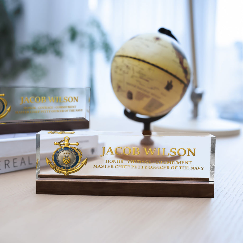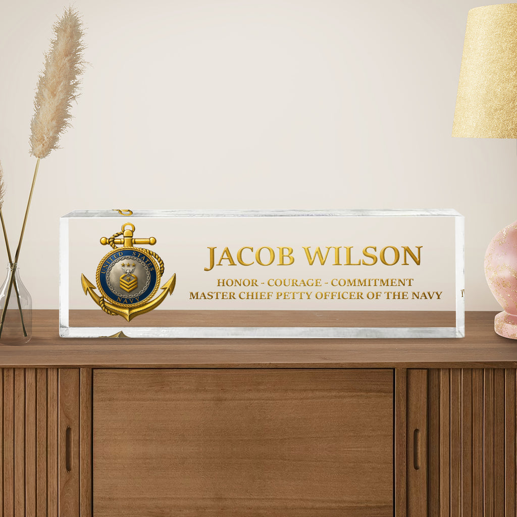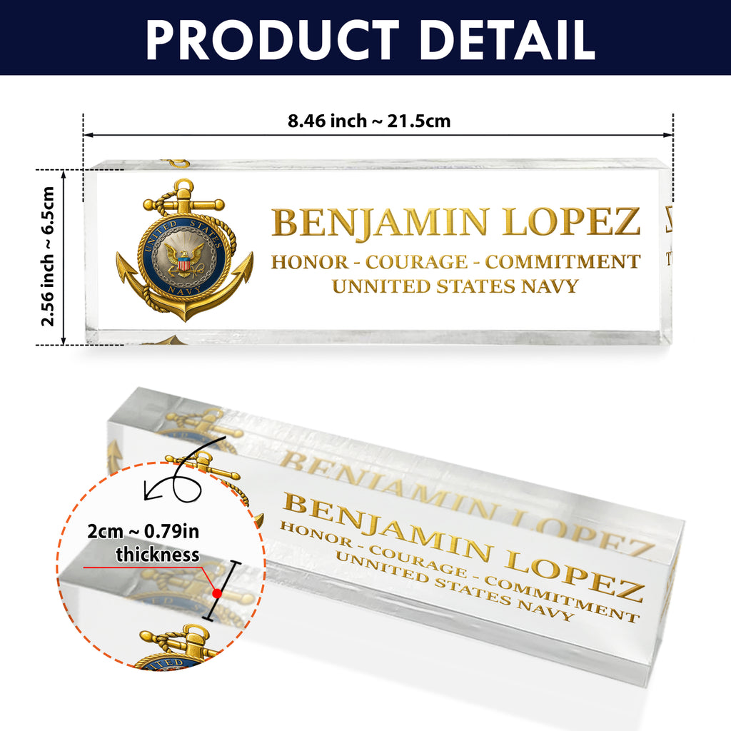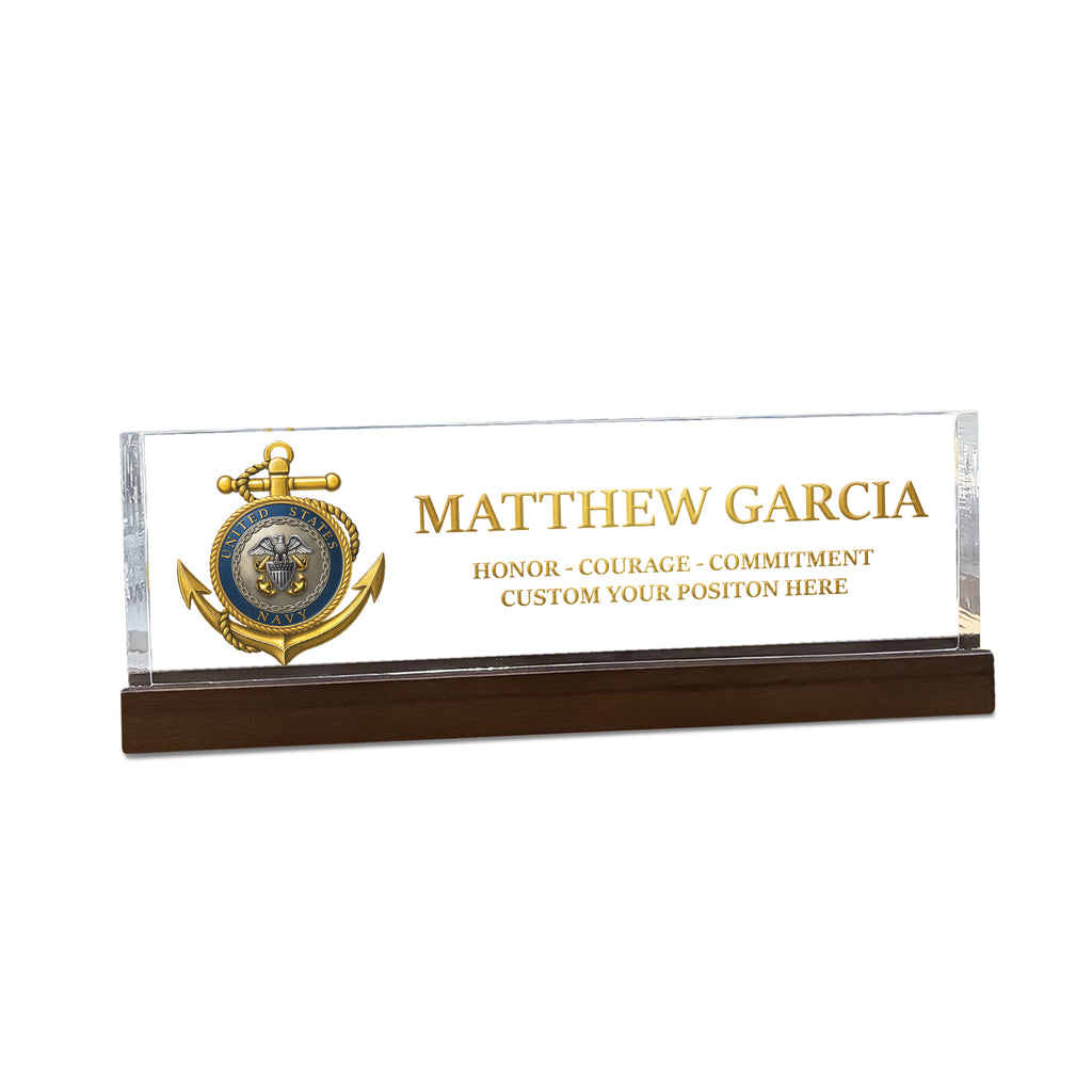 Honor the proud tradition of the United States Navy with this custom acrylic nameplate plaque, designed for active-duty sailors, veterans, and retirees. Personalize it with any name, rank, and service year to create a one-of-a-kind keepsake worthy of display. The refined design makes it ideal for promotions, retirements, or as a highlight piece for the 250th Anniversary of the US Navy. Made from durable, crystal-clear acrylic and printed with vivid detail, this plaque stands as a lasting tribute to courage, commitment, and service.